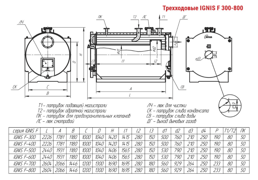 Технические характеристики водогрейного трёхходового котла ARCUS IGNIS F-800