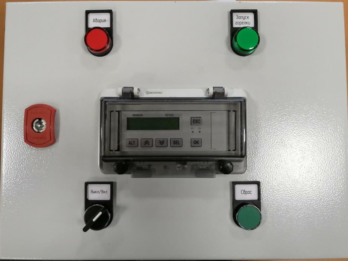 Корпус щита выполнен из металла, крепится на стену. На передней панели (двери) расположены элементы индикации и управления, так же на двери расположено программируемое реле ПР 200 производства ООО «Производственное объединение ОВЕН». На монтажной панели внутри щита установленны автоматические выключатели, промежуточные реле и клеммные колодки, предназначенные для подключения датчиков, исполнительных механизмов и горелки котла.