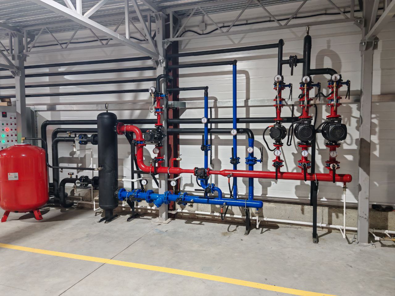 Собираем узлы: насосные группы, фильтры, запорную и регулирующую арматуру, обратные клапаны, расширительные баки, группы безопасности, подпитку, слив или дренаж, узел учёта при необходимости, смесительные узлы, гидрострелку или коллектор.